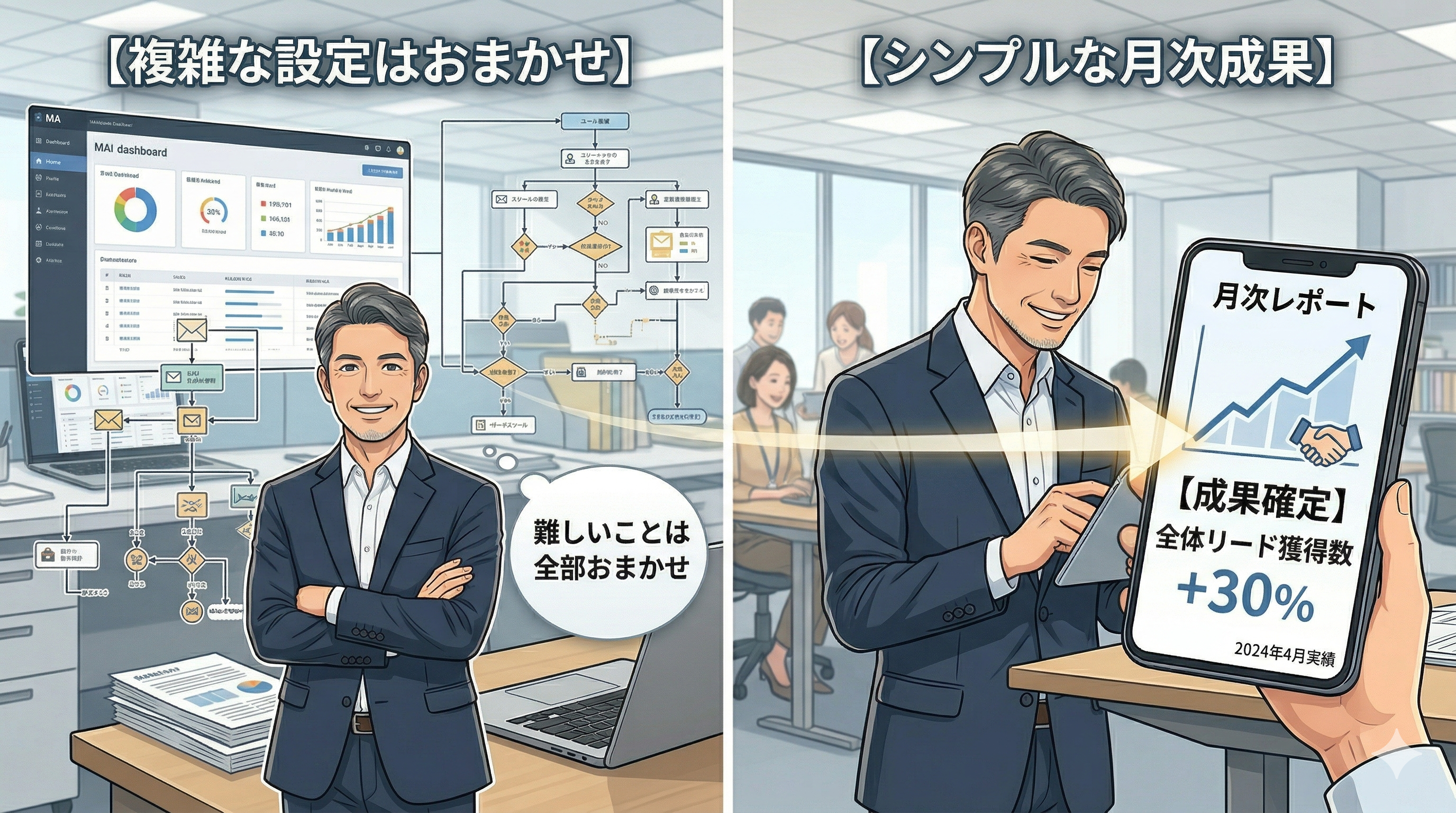 MAツールの設定・メール文面作成・スコアリングルールの調整・シナリオ構築、すべて弊社が担当します。